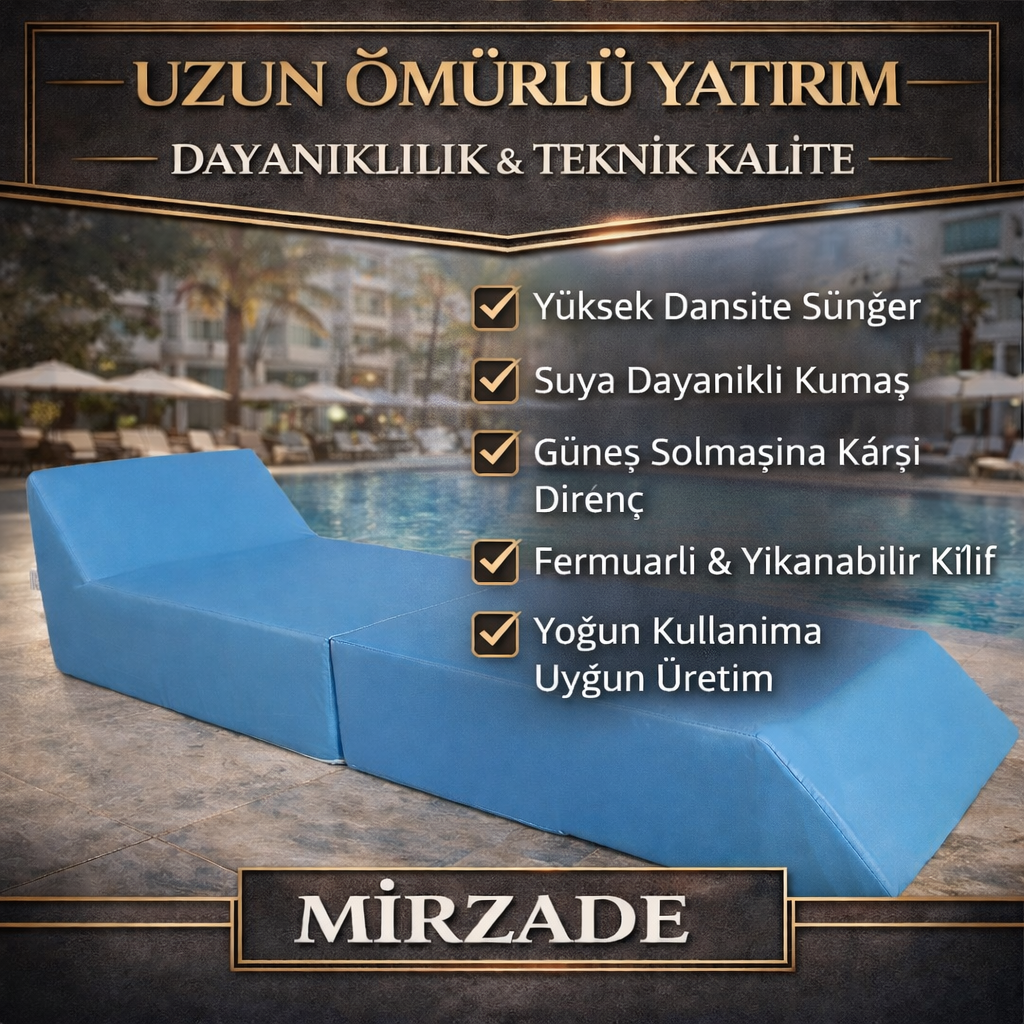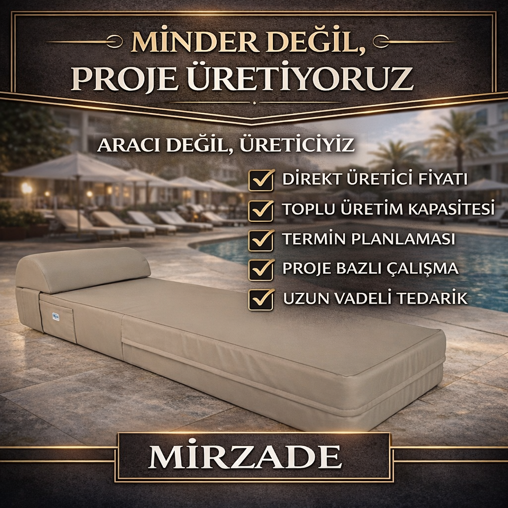 Mirzade, otel ve beach işletmelerine özel geliştirdiği profesyonel minder çözümleriyle dış mekân konforunu ve estetiğini yeniden tanımlar. Üretimden teslimata kadar tüm süreci kendi bünyesinde yöneten Mirzade, işletmenize sadece ürün değil, kalite ve prestij kazandırır.